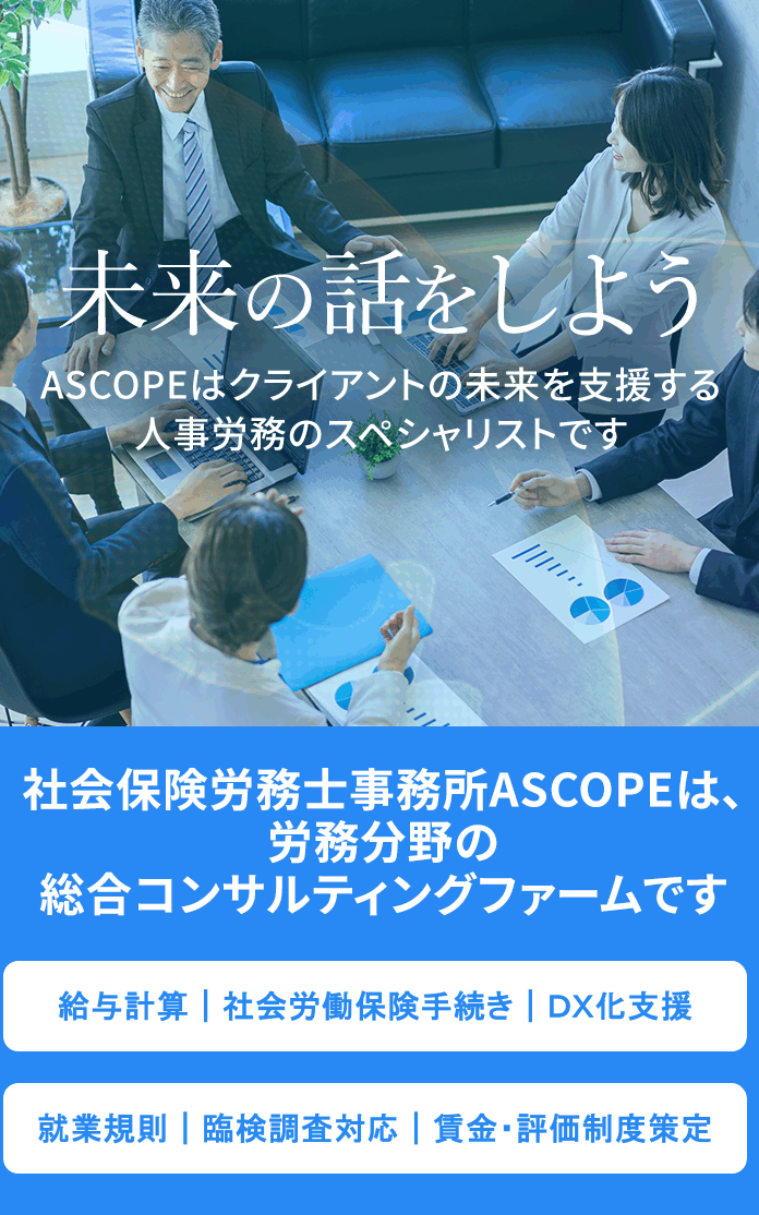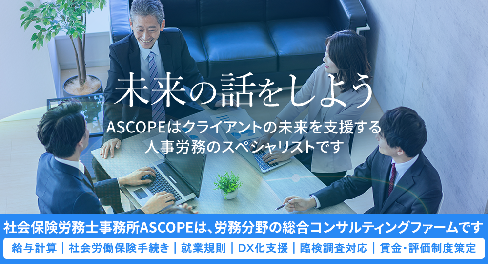 社会保険労務士法人ASCOPEは、法律事務所を起点とする人事労務分野の総合コンサルティングファームです。